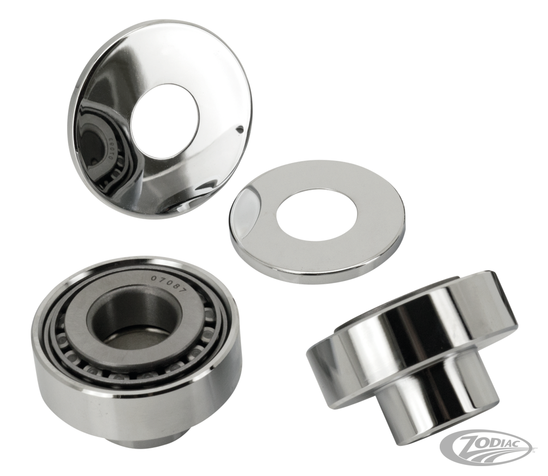 Komplettes Kit mit zwei verchromten Lagerschalen, zwei Timken Lagern und zwei Staubschutzscheiben zum Umrüsten von den serienmäßigen Kugellagern auf Präzisionskegellager in W, WL, WLA, WLC 45CI Solo 1940-1952, G & GE Servi-Car 1940-1973, K, KH, KHK 1952-1956 und XL Sportster 1956-1977.