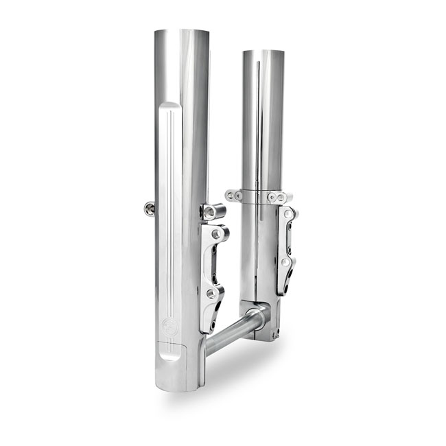Chrome. Dual stock caliper mount. Use with stock H-D FLH fender. Sculpted fork sliders from heat treated aluminum with a machined triple pinstriped and a Performance Machine logo. Complete with a hidden axle design axle; axle covers; caliper mounts that are pre-installed and chrome plated hardware. Perfect to style combine with PM fork sliders; PM wheels and or PM brake calipers. Brake caliper mounts take stock or stock compatible calipers.