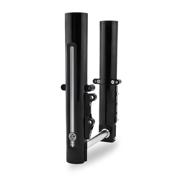 Black anodized Contrast Cut machined finish. Single stock caliper mount. Use with stock H-D FLH fender. Sculpted fork sliders from heat treated aluminum with a machined triple pinstriped and a Performance Machine logo. Complete with a hidden axle design axle; axle covers; caliper mounts that are pre-installed and chrome plated hardware. Perfect to style combine with PM fork sliders; PM wheels and or PM brake calipers. Brake caliper mounts take stock or stock compatible calipers.