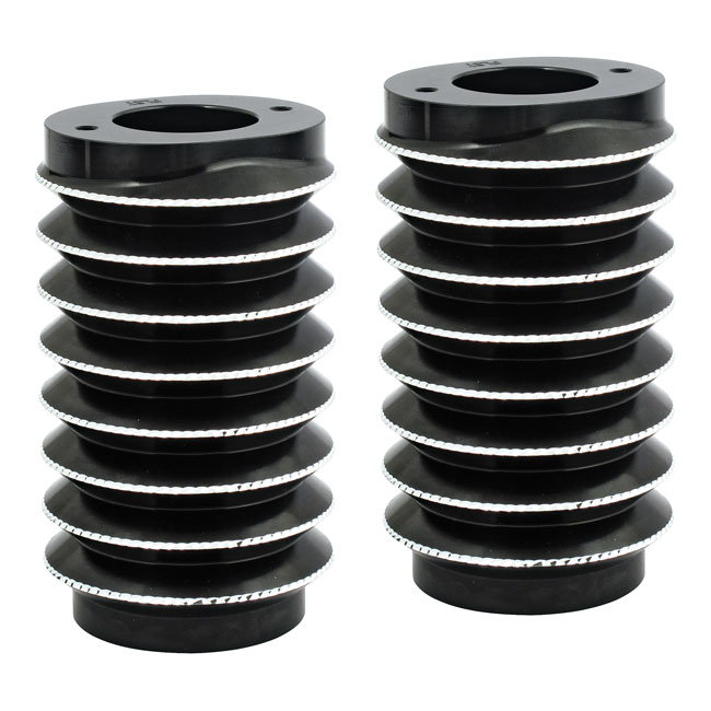 Black anodized with Diamond Cut edges. CNC machined aluminum lightweight upper fork slider covers. Note: Style compatible with stock and Arlen Ness 'Hot Legs' lower fork sliders.