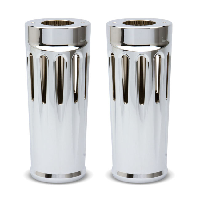 Arlen Ness, Deep Cut fork boots +2". ChromeCNC machined aluminum lightweight upper fork slider covers. Note: Style compatible with stock and Arlen Ness 'Hot Legs' lower fork sliders.
