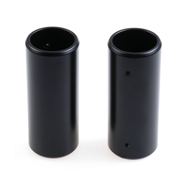 Short version. Gloss black powder coated CNC machined aluminum. This short version can be installed without the removal of the original turn signals. Fits between upper and lower triple tree for that massive muscle bike look. Simply installs over the forktubes and is screwed into place.