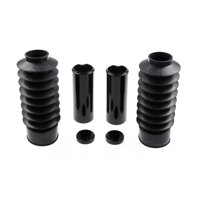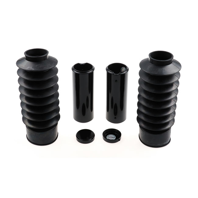 Long version. This kit requires the removal of the original headlamp mask. Turn signals and brackets must be removed. Rubber lower fork boots & gloss black powder coated CNC machined aluminum fork caps and upper fork covers. Covers the full front fork from bottom to top of the upper triple tree. Includes aluminum fork tube caps; upper covers and genuine black rubber bobber boots for a touch of retro. Transforms the complete front end to a massive Black-Out muscle bike look. Compatible with stock and custom fenders. Installs with set-screws. All required hardware is included.