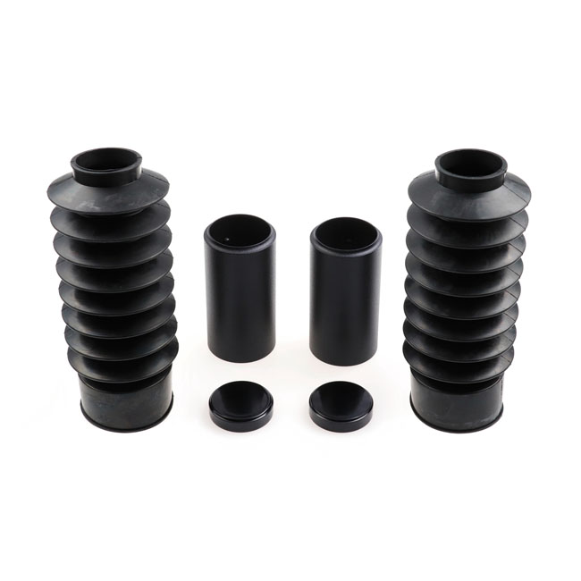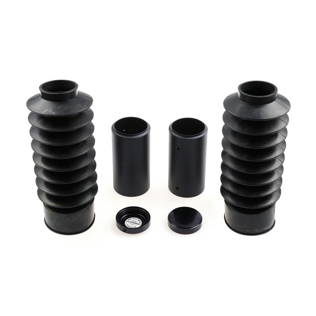 Mid version. This kit is used when a headlamp mask is not used. The optically connect the top fork tubes between the turn signal brackets and the upper triple tree. Rubber lower fork boots & gloss black powder coated CNC machined aluminum fork caps and upper fork covers. Covers the full front fork from bottom to top of the upper triple tree. Includes aluminum fork tube caps; upper covers and genuine black rubber bobber boots for a touch of retro. Transforms the complete front end to a massive Black-Out muscle bike look. Compatible with stock and custom fenders. Installs with set-screws. All required hardware is included.