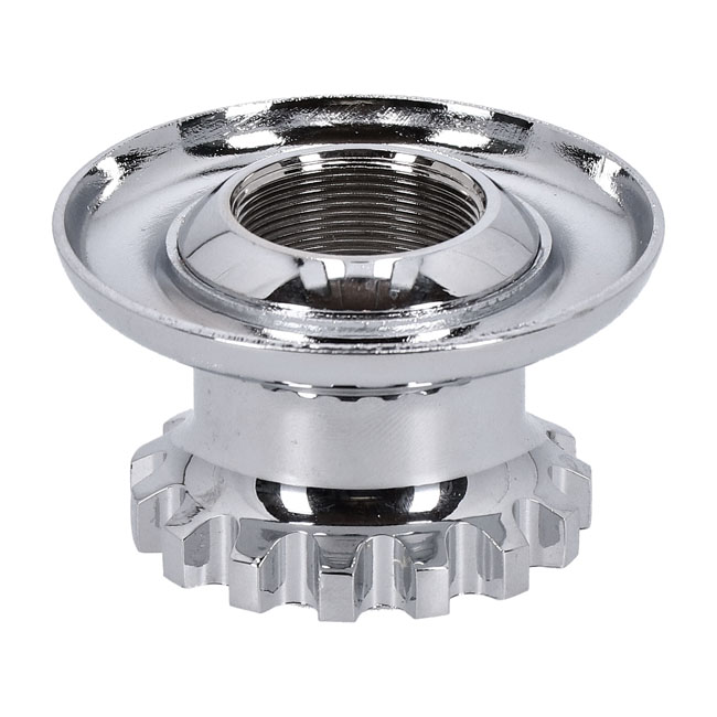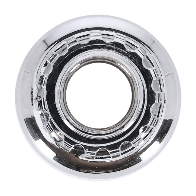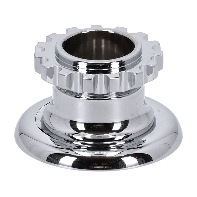 Chrome plated. 1"-24 threaded. Reproduction stem nut for OEM style Springer forks with early OEM style ball bearings. Also called head cone bearing guard nut or stem nut with incorporated dust shield. OEM replacement reference 48327-36 (2753-36)