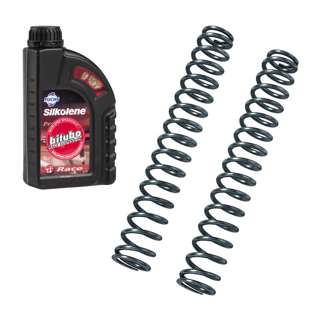 Set includes 2 fork springs for an upgrade installation. Springs are progressive wound and include fork oil. Manufactured from heat treated and shot blasted Cr-Si (chrome silicone) alloy steel. The K value represents the spring rate (stiffness) of the springs. A higher K number are stiffer springs; lower K number are softer springs. Kit includes 2 fork springs; a liter of fork oil and instructions.