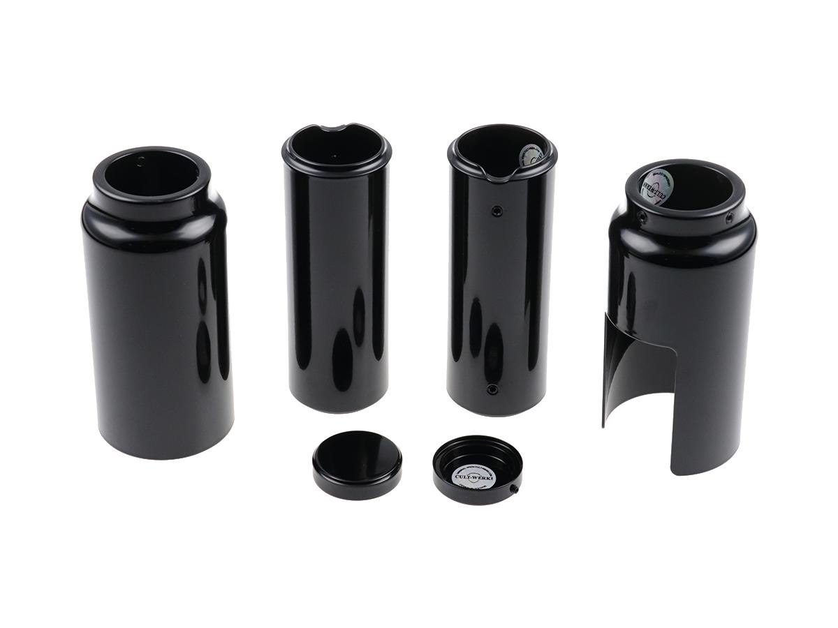 6-Piece Fork Covers with lower Fork Aluminum Covers Long Version, with Cult-Werk Logo, relocated OEM Headlamp Mask and Front Turn Signal Position Gloss Black Powder Coated