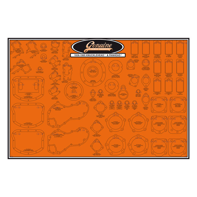 Allows you to get a grip on your sealing department and save time; money and nerves. Complete with mounting and display hardware. Both James and OEM part numbers are printed on the boards and both can be used to order the specific James gasket at Motorcycle Storehouse. Gasket boards come packed and rolled-up in a cardboard tube. Dimensions: 32" (81cm) tall x 48" (122cm) wide x .020" (0.5mm) thick vinyl material. Note: Boards do not include gaskets or seals.