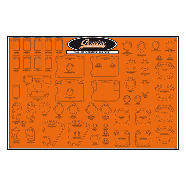 Allows you to get a grip on your sealing department and save time; money and nerves. Complete with mounting and display hardware. Both James and OEM part numbers are printed on the boards and both can be used to order the specific James gasket at Motorcycle Storehouse. Gasket boards come packed and rolled-up in a cardboard tube. Dimensions: 32" (81cm) tall x 48" (122cm) wide x .020" (0.5mm) thick vinyl material. Note: Boards do not include gaskets or seals.