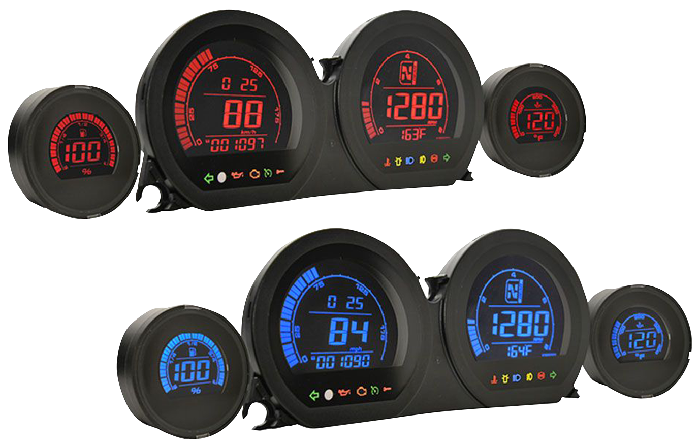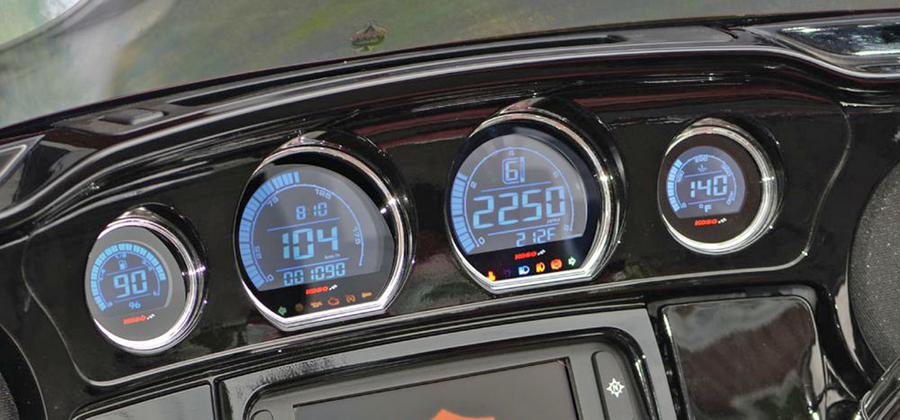 Das Koso HD-03 Set ist die ideale Upgrade-Lösung für Touring 2014-2020. Dieses Plug-n-Play Set ersetzt die Serieninstrumente und lässt sich ohne Bohren oder komplizierte Verkabelung einfach montieren. Schließen Sie die Instrumente einfach an den vorhandenen Kabelbaum an, setzen Sie sie in die Verkleidung ein, fertig! Die Instrumente verfügen über eine blaue oder rote Hintergrundbeleuchtung oder ein 8-farbiges Display und bieten so einen beeindruckenden Look, der Tag und Nacht ein echter Hingucker ist. Das Set umfasst einen 4" Tachometer, einen 4" Drehzahlmesser mit Ganganzeige, eine 2" Öltemperaturanzeige und eine 2" Tankanzeige. Der Tachometer zeigt Geschwindigkeiten von 0-299 km/h (0-199 mph) an, warnt bei Geschwindigkeitsüberschreitung durch Aufleuchten einer Warnleuchte ab einem festgelegten Wert und speichert die Höchstgeschwindigkeit. Der Kilometerzähler reicht bis 999.999 km (Meilen), die Tageskilometerzähler A/B bis 9.999,9 km (Meilen) und die Wartungsintervalle sind von 500-16.000 km (300-10.000 Meilen) einstellbar. Der Drehzahlmesser zeigt Drehzahlen bis 9990 U/min an, verfügt über eine integrierte Schaltanzeige und die maximale Drehzahl ist von 0 bis 8000 U/min einstellbar. Die Öltemperaturanzeige reicht von 40 bis 300°C (40 bis 572°F) und speichert die maximale Öltemperatur. Die Tankanzeige ist auf ein Tankvolumen von 1,0 bis 9,9 US Gallonen einstellbar und zeigt den Kraftstoffverbrauch in l/100 km, km/l, MPG (US) oder MPG (UK) an. Sie zeigt außerdem die Reichweite von 0 bis 9999 km (6249 Meilen) an. Das LCD Display zeigt "LO RNG" an und linkt, wenn die Reichweite unter 16 km (10 Meilen) liegt. Weitere Merkmale sind eine 12/24 Stunden-Uhr, ein Voltmeter, eine Anzeige für Betriebstemperatur und Betriebsspannung sowie Kontrollleuchten für Blinker, Ölstand, Motorwarnung, Tempomat, Wegfahrsperre, Wassertemperatur, Warnleuchte, Fernlicht, Nebelscheinwerfer und ABS. Das Koso HD-03 Set ist eine leistungsstarke Lösung für Fahrer, die ihre Instrumente einfach und effektiv aufrüsten möchten. Das Set wertet nicht nur die Optik des Motorrads auf, sondern bietet auch präzise und praktische Funktionen wie Ganganzeige, individuell einstellbare Tankanzeige und diverse Warnfunktionen. Perfekt für Fahrer, die ihr Motorrad optimal nutzen möchten.