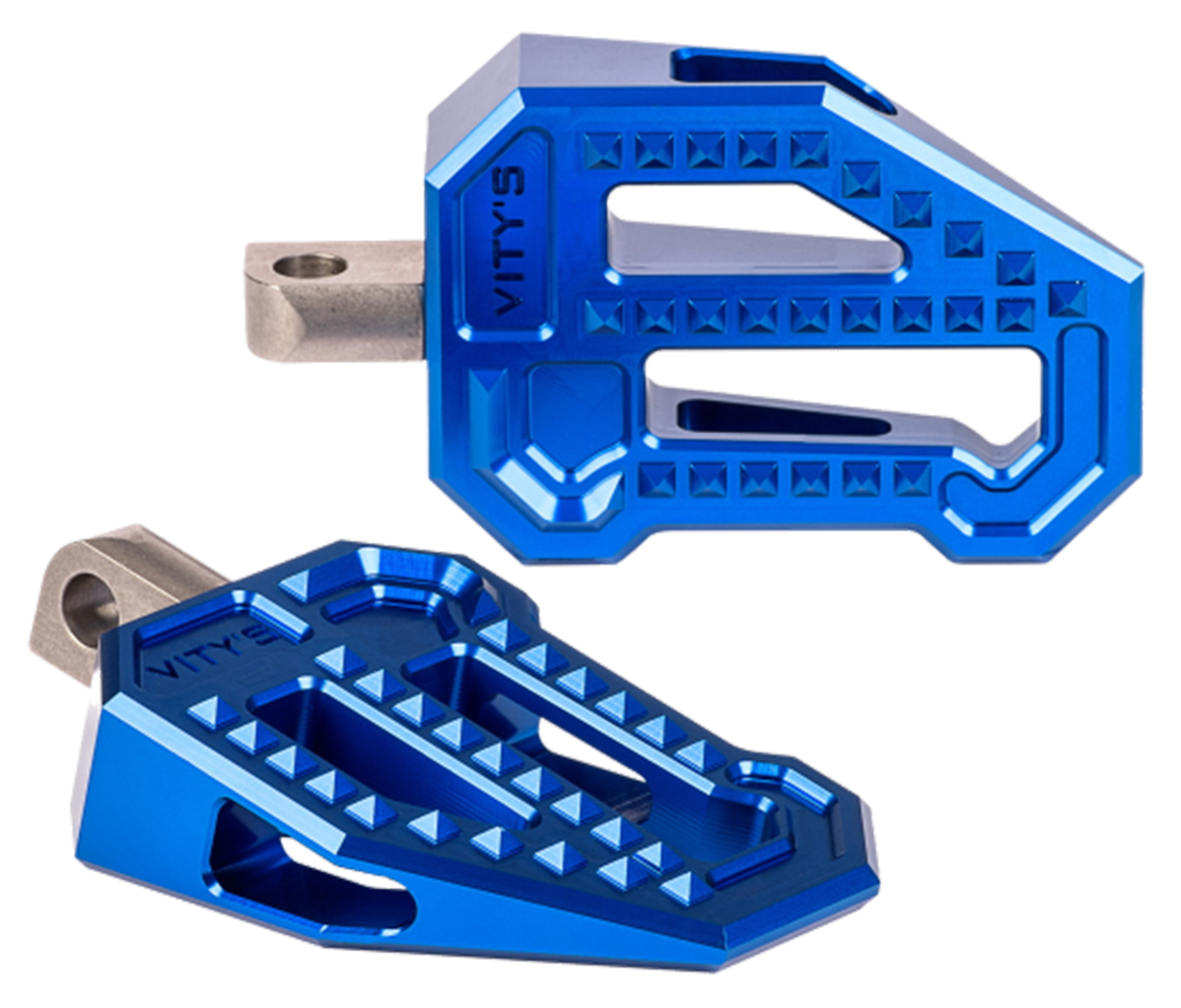 Diese Fußrasten verleihen Ihrem Motorrad einen sportlichen und dynamischen Look. Wie die originalen Vity's Racing Trittbretter verfügen auch diese über das gleiche Rautenmuster für maximalen Grip und Komfort sowie über zahlreiche Farbkombinationen, die perfekt zu Ihrem individuellen Bike passen.