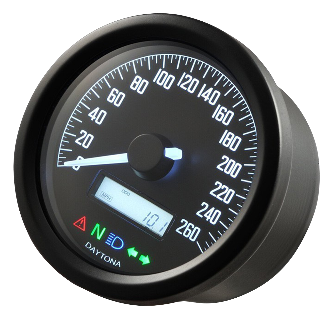 The LED lighting on these stepping motor-driven meters is selectable in three different colours: white, blue and orange. The electronic speedometer can be set to display km/h or MPH and is equipped with an odometer, two trip meters and a voltage meter with a range from 0 to 18V. The tachometer is equipped with a maximum RPM memory and recall function, a voltage meter with a range from 0 to 18V and a red LED shifter warning light. Speedo works with the stock speed sensor and you will need a breakout box for the RPM meter on later models. The speedometer has integrated indicator lights.