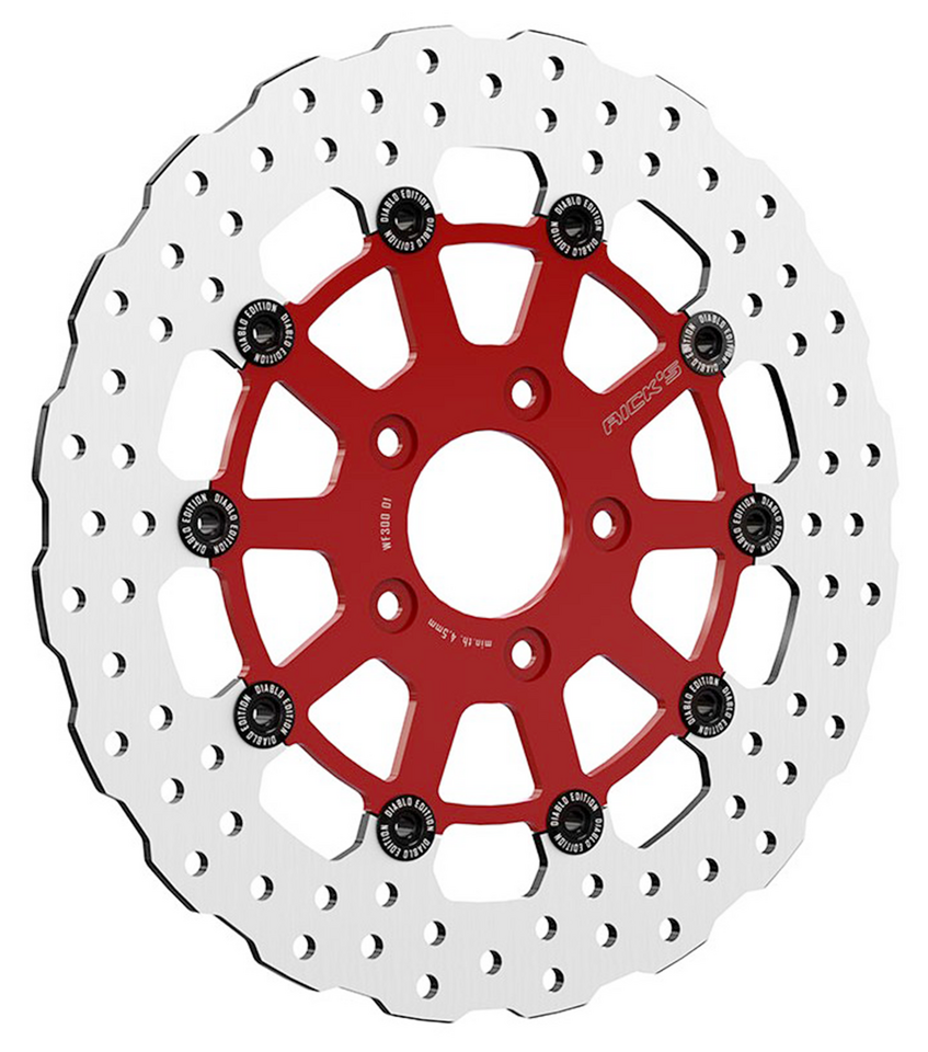 Fits front on V-Rod 2007-2010 with wire wheels, Dyna 2006-2007 with hub mounted disc, Sportster 2014-2022, FLHR & FLHRC Road King 2008 to present, Touring 2008-2013 and Softail 2015 to presentHub mounted disc has 11.8" (300mm) outer diameter, 2 7/32" (56.4mm) inner diameter and five 5/16" counterbore mounting holes on a 3 1/4" circle, Steve, red (TÜV)