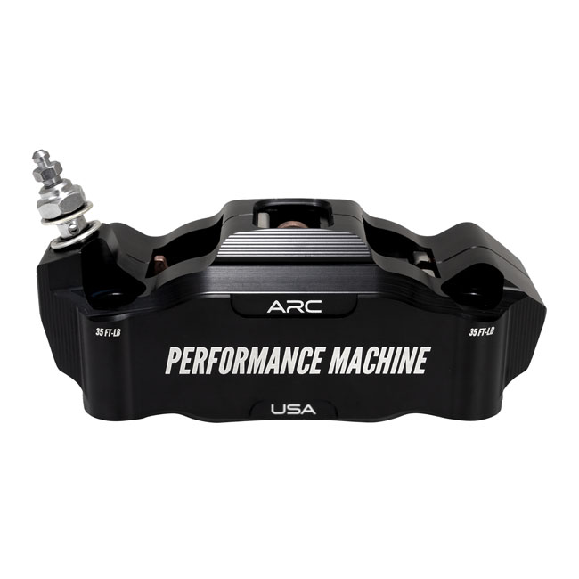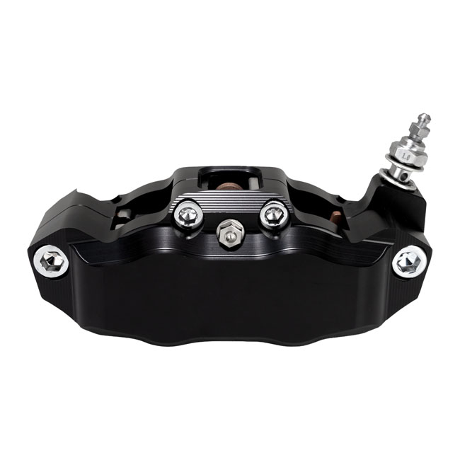 Black anodized finish. 4-piston radial billet aluminum caliper. Universal fit for all 108mm sized radial caliper brackets and forks. Designed with ARC (Advanced Radiant Cooling) technology to improve your braking feel by providing more rigidity and maximum cooling efficiency for better heat control and ultimately to offer a better; crisp; brake feel. - Increased rigidity for improved braking performance- CNC machined billet aluminum - ARC Technology for maximum cooling efficiency- Designed for use with 5mm (.200") thick brake rotors - ABS and non-ABS compatible - Used with 108mm mounting bolt spacing brackets - Includes chrome mounting hardware - 4-piston caliper with 1.25" diameter pistons - Includes brake pads. Note: See 704595 for right side caliper