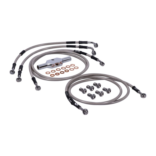 Stainless clear coated brake lines with high polished stainless steel hose ends. Ready to install; with correct length and fittings for stock applications. Note: Upper front (handlebar master cylinder) to ABS box + ABS box to brake caliper(s). Note: With approval. Check your local MCS dealer or the MCS sales department for exact type of approval and validity on bike model and years on the test report.