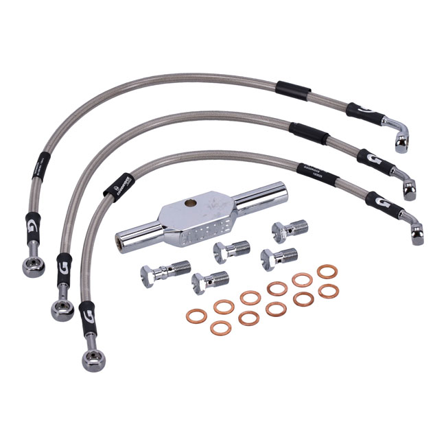 Stainless clear coated brake lines with high polished stainless steel hose ends. Ready to install; with correct length and fittings for stock applications.Note: With approval. Check your local MCS dealer or the MCS sales department for exact type of approval and validity on bike model and years on the test report.