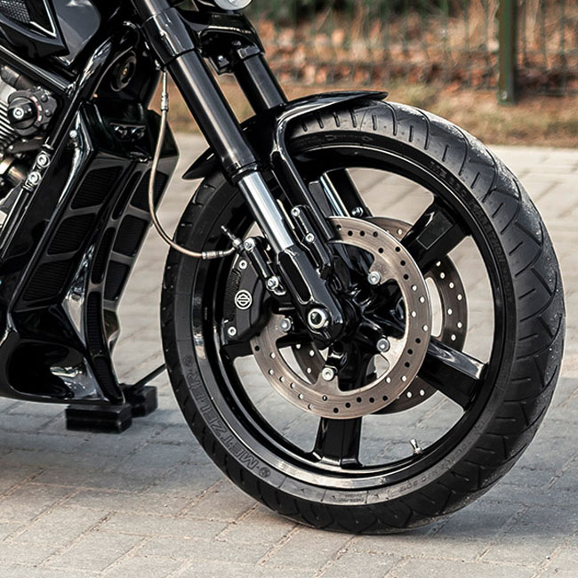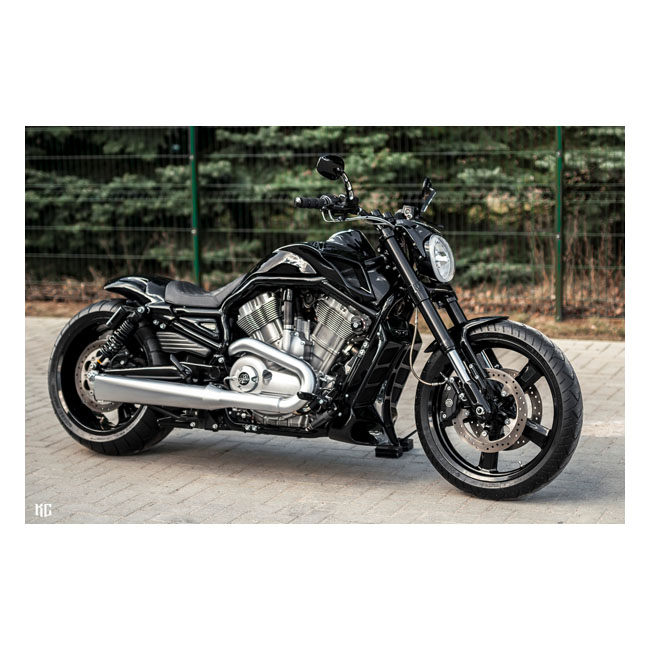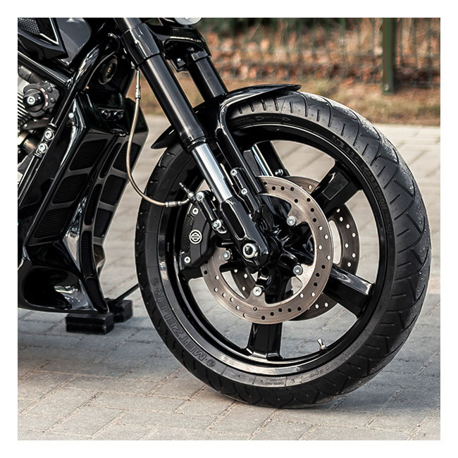The 'Tidy' front fender is significantly shorter and narrower than the original and has neatly shaped holes with black mesh inside for a custom look. Made of hand-laid unpainted gel coated fiberglass that is very stiff; strong; straight; and light. It comes pre-drilled; all necessary mounting hardware is included. Note: Fitment checks are always advised before painting and final assembly.