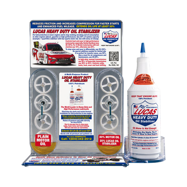 Shop use. Place on your counter and let customers educate themselves by turning the handles. Used to demonstrate the way Lucas Heavy Duty Oil Stabilizer actually works. Pre-filled on one side with regular motor oil and the other side with regular motor oil where Lucas Oil Stabilizer is added; allowing on-the-spot comparison.