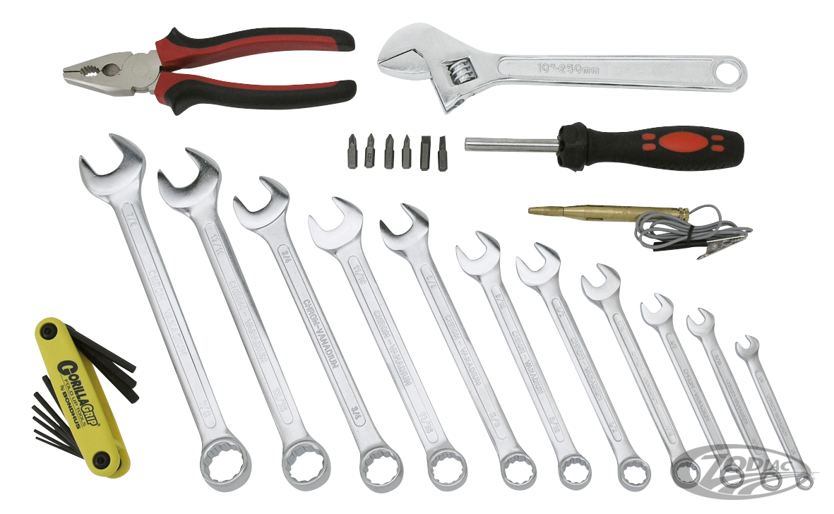 Als Bordwerkzeug für jeden Harleyfahrer zusammengestellt. Beinhaltet alle nötigen Werkzeuge für Reparaturen unterwegs. Der Satz beinhaltet: 11-teiligen Ring/Maul-Schlüsselsatz (zöllig), Faltheft mit 9 Innensechskantschlüssel, Schraubenzieher mit 5 verschiedenen auswechselbaren Köpfen, Zange, Engländer und eine Prüflampe (6 bis 24 Volt). Alle Teile in einer schönen Werkzeugrolle.