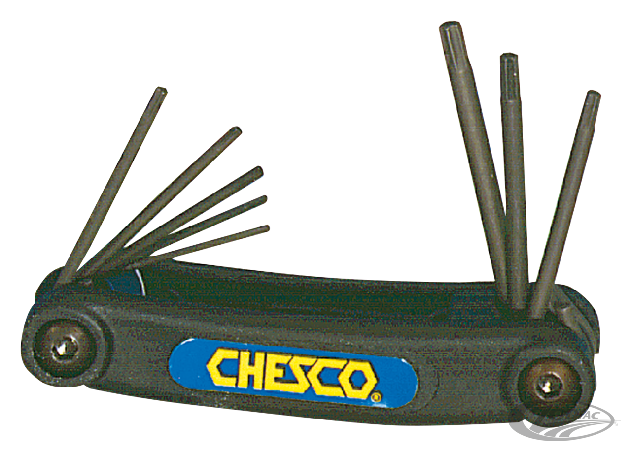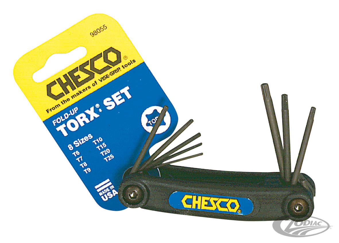 Handliche, platzsparende Torxschlüssel Sets. Harley verwendet Schrauben mit diesen Köpfen z.B. an den Bremszangen und Lichtmaschinen Statoren der späten Modelle. Erhältlich im 8er Heft.