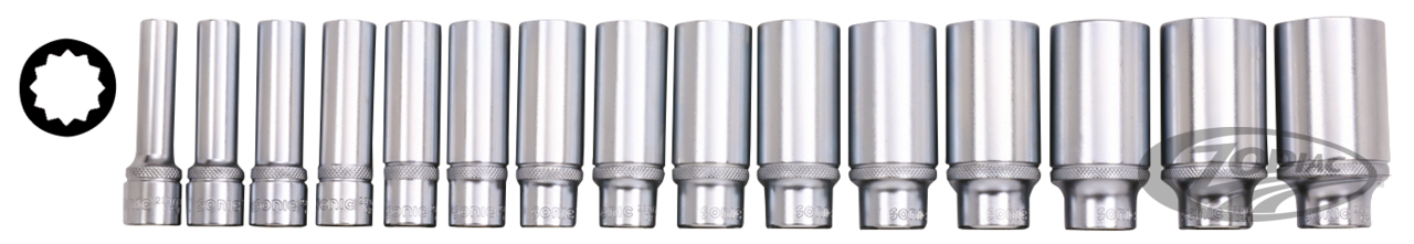 1/2" Steckschlüsselsatz 12-Kant extralang (SAE) 15-teilig; 3/8", 7/16", 1/2", 9/16", 5/8", 11/16", 3/4", 13/16", 7/8", 15/16", 1", 1 1/16", 1 1/8", 1 3/16" & 1 1/4"