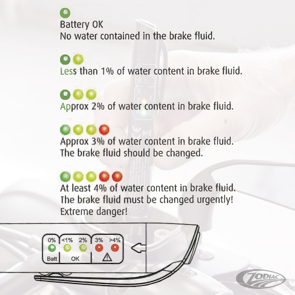 Kompakter, batteriebetriebener Tester zur Ermittlung des Wasseranteils in der Bremsflüssigkeit mit heller LED Anzeige. Kann für DOT 3, 4 und 5.1 verwendet werden.