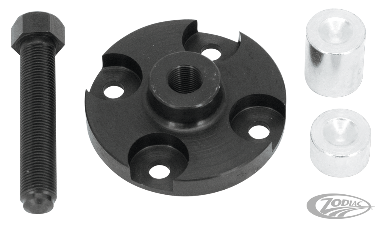 Dieser Abzieher aus gefrästem Aluminium zeichnet sich durch besonders hohe Haltbarkeit aus. Dieses einmalige Werkzeug wird direkt an den Stehbolzen der Nabe befestigt. Durch Hineindrehen des Gewindestiftes wird Druck auf die Hauptwelle ausgeübt und die Nabe somit abgezogen. Dieses Werkzeug erleichtert die Wartungsarbeiten an Pro-Clutch Kupplungen um einiges. Zu verwenden an allen Big Twin mit Competition Master Clutch, Pro-Clutch Kupplung oder Primo Primär Riemenantrieben mit Diaphragm-Feder.