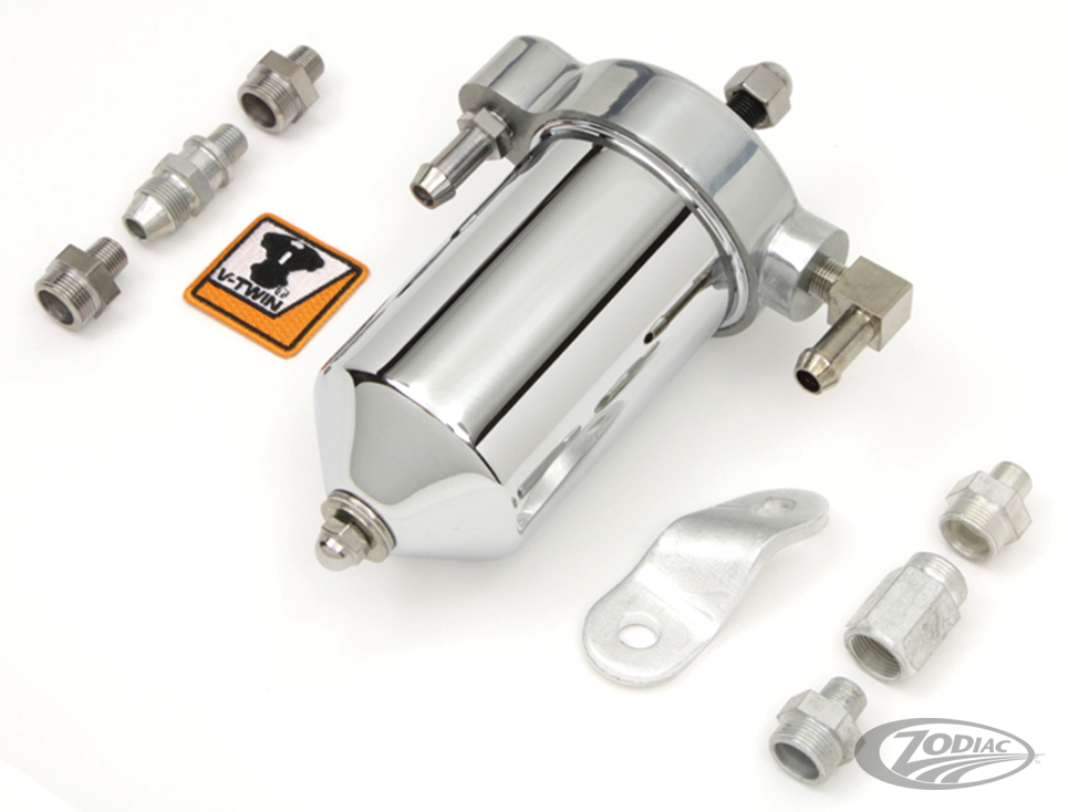 Diese Filterkits verfügen über Steck- Schlauchanschlüsse, welche auch durch Einschraubfittinge ersetzt werden können um OEM-Metallleitungen zu akzeptieren. Big Twin 1940-1964. Baujahr entsprechende Halterungen müssen separat bestellt werden.
