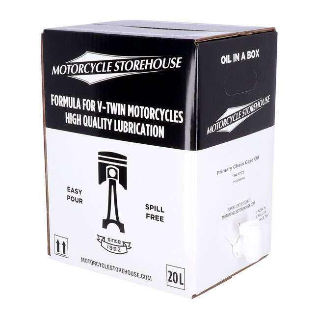 20 liter Bag-In-Box. Primary chain case lubricant. High quality lubrication; specially developed for use in stock and aftermarket H-D V-Twin models. Our oil engineers used quality base oils blended with the right additives to achieve the lubrication characteristics that can be trusted to give the ultimate protection for your bike in all circumstances. Proudly engineered and manufactured in The Netherlands. Note: This 20 liter Bag-In-Box packing system is environmentally friendlier alternative for the classic plastic canister. It allows practical storage on a shelf and comes with an inner plastic bladder bag with a pre-installed tap; for easily tapping the required amount of oil. This proven & dependable Bag-In-Box system saves 89% on plastic; the sturdy and protective outer box has convenient carrying handles and is 100% recyclable.