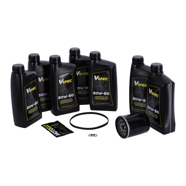 Includes: 7 liters SAE 20W50 3-1 full synthetic engine / primary / transmission oil; 62700297 oil filter black; 17369-06 O-ring seal derby cover; 11105 O-ring drain plug. Quality 20W50 full synthetic Vspec oil. Special All in One solution blend for use as engine / primary / transmission oil. Okay to mix with all mineral and semi-synthetic oils. Meets or exceeds JASO MA/2. Our 'Big Oil' kit includes enough Vspec engine; transmission and primary oil to service the specific models as mentioned. Kit includes a chrome or black spin-on oil filter and all required drain plug seals and a primary derby/inspection cover gasket/seal to get the job done. The 'Big Oil' kit is perfect to full oil-service your bike during a regular service interval or before you store it for the for the winter period. Note: Comes with genuine Vspec high quality motor oil for all stock to high output engines. Note: OEM part numbers are given for reference only. Note: Used oil may contain harmful acids and/or other contaminants. Therefore it is advised to do an oil and filter change before winter storage. Note: Check your service manual for the recommended factory oil change intervals and oil change quantities.