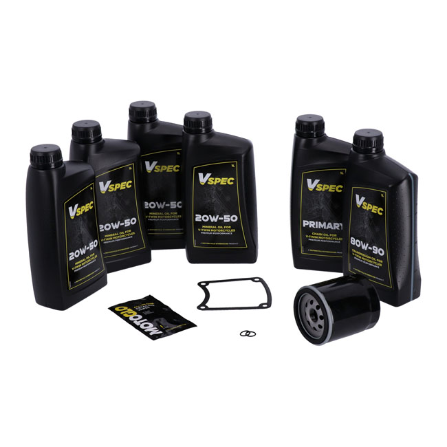 Includes: 6 liters SAE 20W50 3-1 full synthetic engine / primary / transmission oil; 63731-99A oil filter black; 34906-85D inspection cover gasket; 11105 O-ring drain plug. Quality 20W50 full synthetic Vspec oil. Special All in One solution blend for use as engine / primary / transmission oil. Okay to mix with all mineral and semi-synthetic oils. Meets or exceeds JASO MA/2. Our 'Big Oil' kit includes enough Vspec engine; transmission and primary oil to service the specific models as mentioned. Kit includes a chrome or black spin-on oil filter and all required drain plug seals and a primary derby/inspection cover gasket/seal to get the job done. The 'Big Oil' kit is perfect to full oil-service your bike during a regular service interval or before you store it for the for the winter period. Note: Comes with genuine Vspec high quality motor oil for all stock to high output engines. Note: OEM part numbers are given for reference only. Note: Used oil may contain harmful acids and/or other contaminants. Therefore it is advised to do an oil and filter change before winter storage. Note: Check your service manual for the recommended factory oil change intervals and oil change quantities.