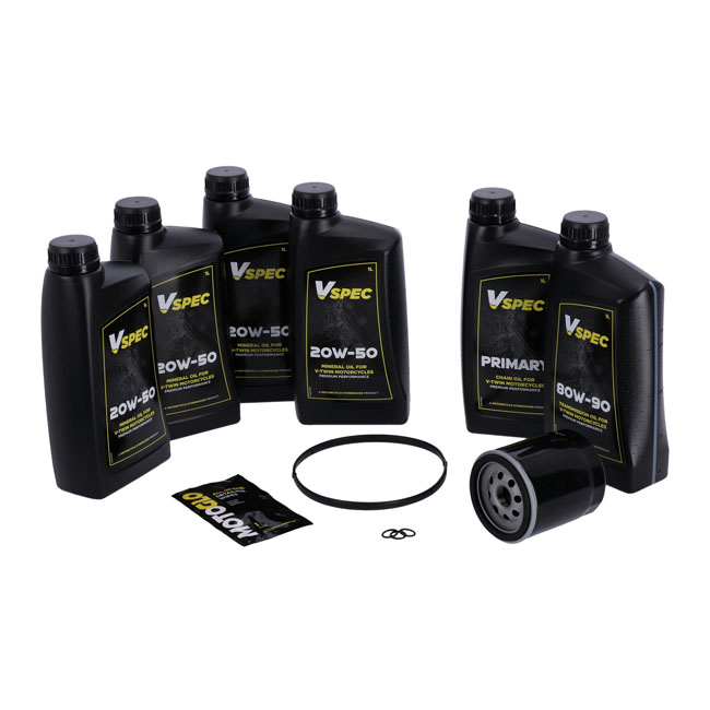 Includes: 4 liters SAE 20W50 mineral engine oil; 63731-99A oil filter black; 1 liter primary case oil; 1 liter 80W90 transmission oil; 17369-06 flat style 'O-ring' derby cover; 11105 O-ring drain plug. Quality mineral SAE 20W50 multigrade Vspec engine oil for bikes that require mineral engine oil. Meets or exceeds JASO MA/2. Our 'Big Oil' kit includes enough Vspec engine; transmission and primary oil to service the specific models as mentioned. Kit includes a chrome or black spin-on oil filter and all required drain plug seals and a primary derby/inspection cover gasket/seal to get the job done. The 'Big Oil' kit is perfect to full oil-service your bike during a regular service interval or before you store it for the for the winter period. Note: Comes with genuine Vspec high quality motor oil for all stock to high output engines. Note: OEM part numbers are given for reference only. Note: Used oil may contain harmful acids and/or other contaminants. Therefore it is advised to do an oil and filter change before winter storage. Note: Check your service manual for the recommended factory oil change intervals and oil change quantities.