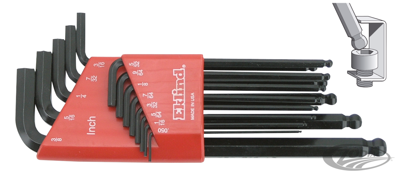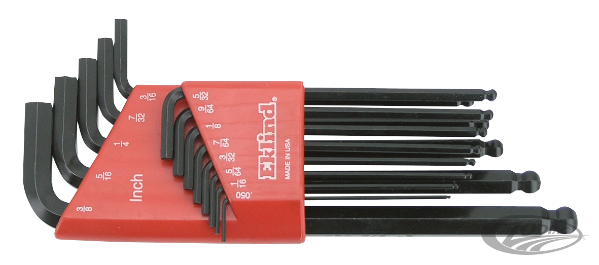 It is not without reason they say, "Good tools are half the job". We offer a complete line of USA made High Quality Allen head and Torx head keys, screw drivers and T-handle drivers made by Eklind, the world leader in manufacturing allen keys and similar. Each kit is manufactured of 8650 alloy steel for years of trouble free use. These professional quality tools are now available at very competitive prices. Since the introduction of the V-Rod, metric sizes have become a must in every Harley workshop too, that's why we now offer these kits in both metric and standard. The best for the custom builder and a must for the professional workshop. Ball end driver offers you an easy fastening in an up to 35 degree angle. Holder kits also available with extra short stubby end.