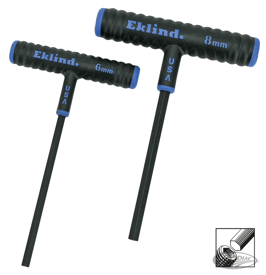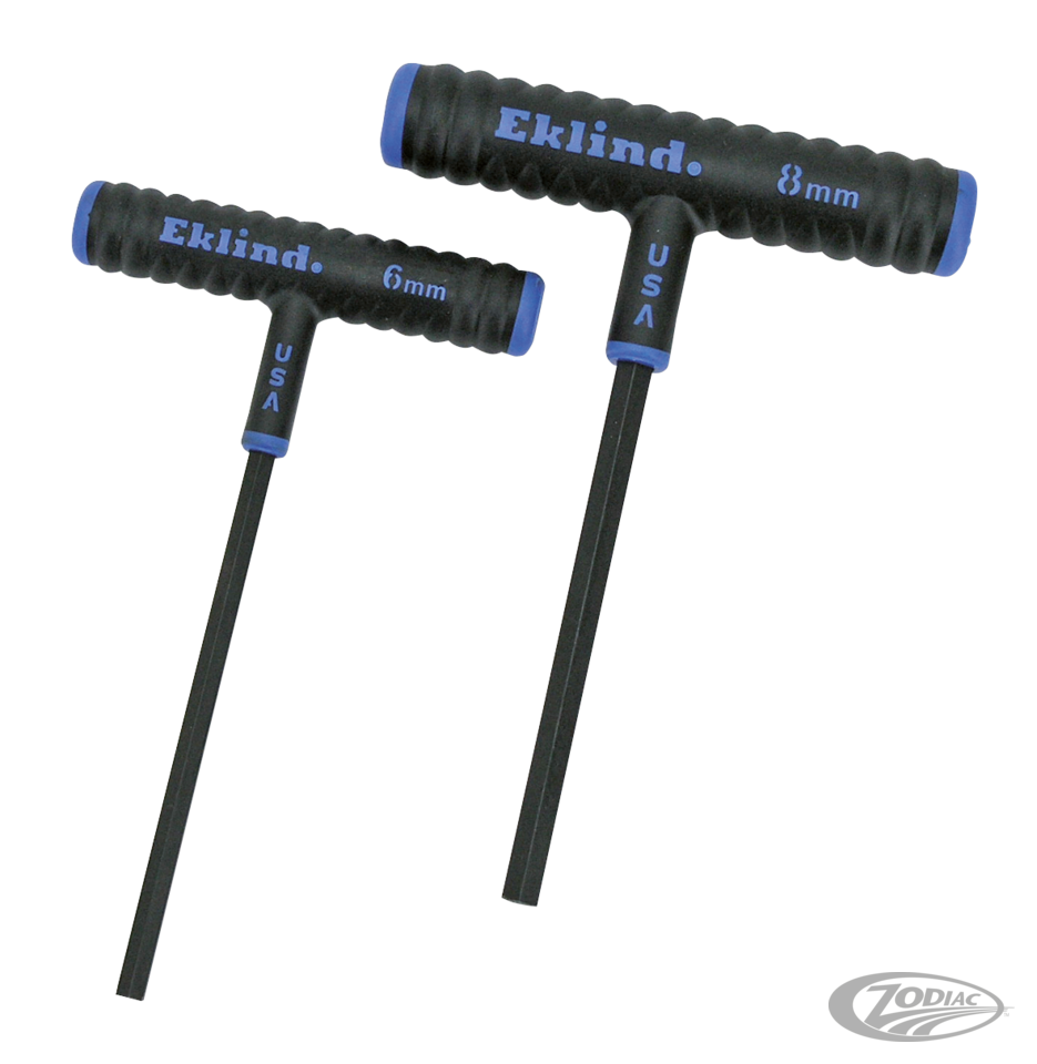 It is not without reason they say, "Good tools are half the job". We offer a complete line of USA made High Quality Allen head and Torx head keys, screw drivers and T-handle drivers made by Eklind, the world leader in manufacturing allen keys and similar. Each kit is manufactured of 8650 alloy steel for years of trouble free use. These professional quality tools are now available at very competitive prices. Since the introduction of the V-Rod, metric sizes have become a must in every Harley workshop too, that's why we now offer these kits in both metric and standard. The best for the custom builder and a must for the professional workshop. Ball end driver offers you an easy fastening in an up to 35 degree angle. Holder kits also available with extra short stubby end.