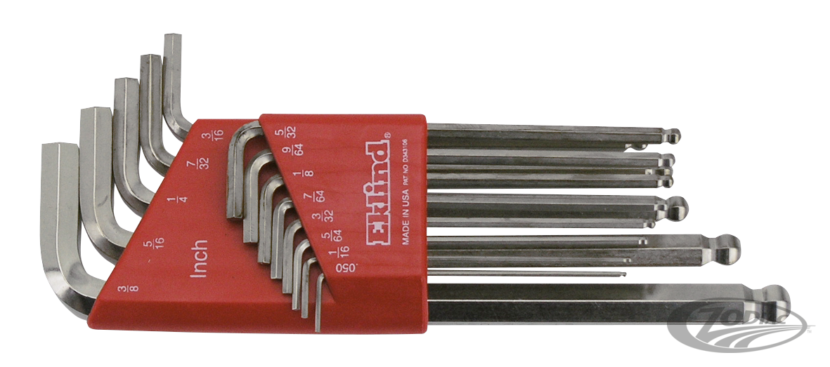 It is not without reason they say, "Good tools are half the job". We offer a complete line of USA made High Quality Allen head and Torx head keys, screw drivers and T-handle drivers made by Eklind, the world leader in manufacturing allen keys and similar. Each kit is manufactured of 8650 alloy steel for years of trouble free use. These professional quality tools are now available at very competitive prices. Since the introduction of the V-Rod, metric sizes have become a must in every Harley workshop too, that's why we now offer these kits in both metric and standard. The best for the custom builder and a must for the professional workshop. Ball end driver offers you an easy fastening in an up to 35 degree angle. Holder kits also available with extra short stubby end.
