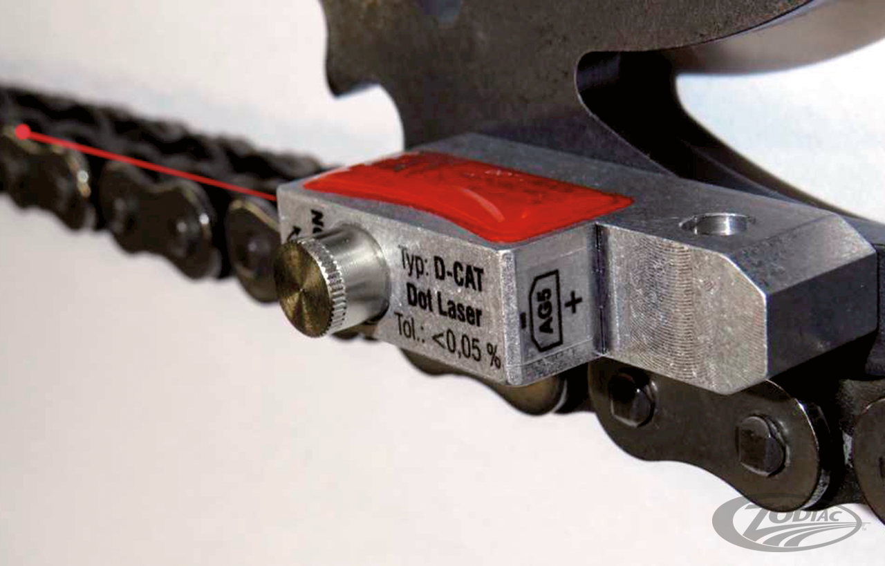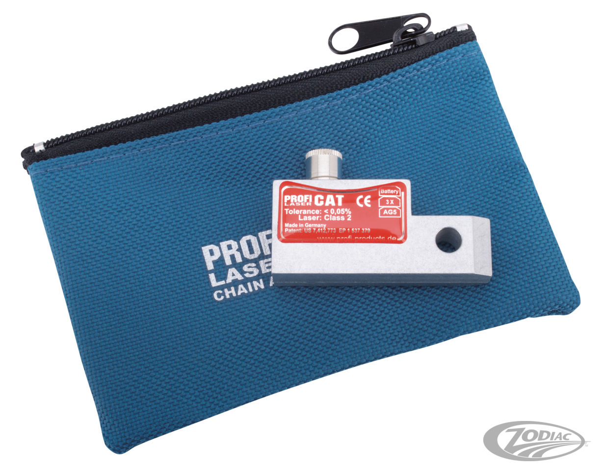 Whenever you have removed the rear wheel of your motorcycle, you need to re-align the chain or belt. This handy tool really takes the guesswork out of this job. By simply putting the Chain Alignment Tool on your sprocket or pulley, the laser beam indicates if everything is lined up properly. Correct alignment increases the lifetime of your complete drive train, tire, and wheel bearings, reduces fuel consumption and improves road holding. This Class-2 quality laser features a tolerance of less than 0.01mm per meter chain or belt and comes complete with three AG5 batteries. The Chain Alignment Tool is Made in Germany and economically priced-every bike owner should have one in his toolbox. It definitely is a must for professional workshops.