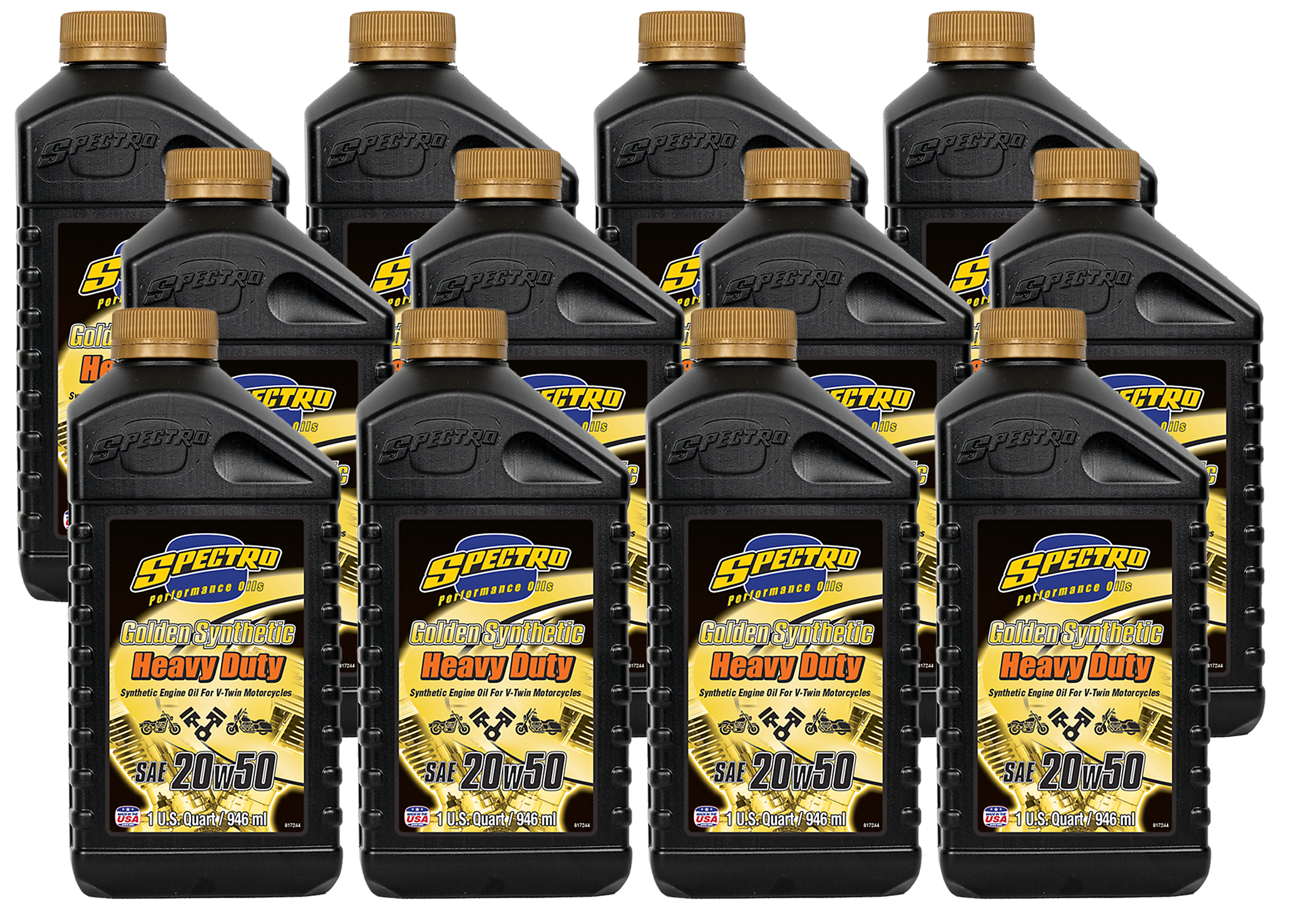 Spectro's newest synthetic V-Twin engine oil. This synthetic oil provides reduced friction, offers tremendous lubrication and provides superior protection in extreme heat conditions. Heavy Duty Golden Synthetic Group 3 base oils are combined with the most advanced anti-wear additive packs available to reduce wear, extend component life, and eliminate valve sticking. Meets all known OEM warranty requirements.