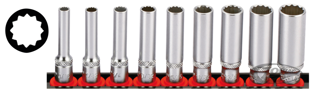 1/4" drive 9-piece 12-point flank inch size deep socket set; 3/16", 7/32", 1/4", 9/32", 5/16", 11/32", 3/8", 7/16" & 1/2"