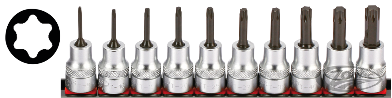 3/8" drive 10-piece Torx socket bit set; T8, T10, T15, T20, T25, T27, T30, T40, T45 & T50