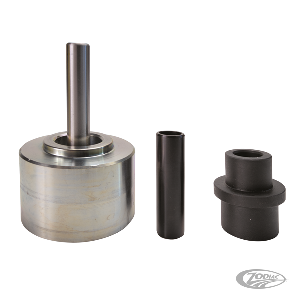 Use this tool to remove and install the compensator ball bearing, after the rear pulley is removed from the rear wheel drive bowl on 2008 to present V-Rod, Sportster and Touring models. This ball bearing is now positioned with the rubber isolators in the drive bowl. This tool will center and guide the installer plug with the center of the pulley for safe bearing removal and installation.