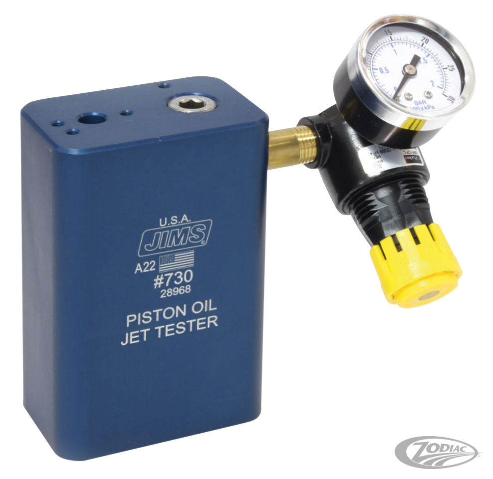 Do not let malfunctioning piston jets cause engines to sump or overheat, test them before you install them. Located deep inside the engine cases it is hard to verify whether these piston jets are functioning properly. Not any longer as this Jims piston jet test stand allows engine builders to test them for proper operation before installing them. The unit operates on both compressed air, and air over oil. When operating with air only, verification of proper flow through the piston jet can be witnessed. In the air over oil mode you can not only check for proper operation, but also physically see the oil spray pattern emanating from the jet. By adjusting the air regulator on the unit, mechanics are able to determine at what pressure the piston jet turns on and off. An additional benefit of the piston jet test stand is the ability to clear assembly lube from the jet's narrow oil passage.