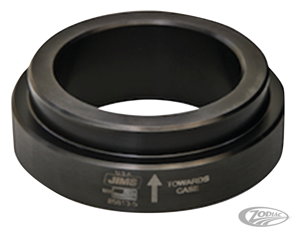 This adapter for the ZPN 753687 Jims main bearing tool is a simple time and money saver when installing the main bearing on a Milwaukee Eight left side crankcase. Simply position this adapter on top of the bearing support on the press table. When this adapter is used in conjunction with the JIMS® No.5813 main bearing tool, or OE tool, the stator can remain attached to the left side case during bearing installation. The technician will save the time of removing and installing the stator. The adapter has been designed with added clearance for the stator screws, which are one time use only screws. It will also guarantee that the case plug seal of the stator is not compromised resulting in a leak.