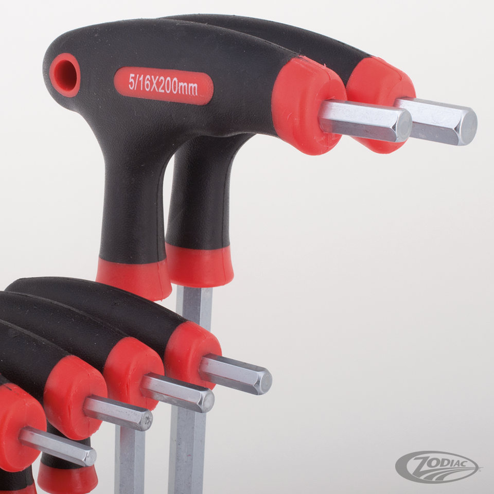 Chrome Vanadium Allen head wrench set with ergonomic handles for semi-professional use. Keys can be used on both the short and long end. The straight ends do not allow for use under an angle. Contains sizes 3/32", 7/64", 1/8", 9/64", 5/32", 3/16", 7/32", 1/4", 5/16" and 3/8" in a metal holder.