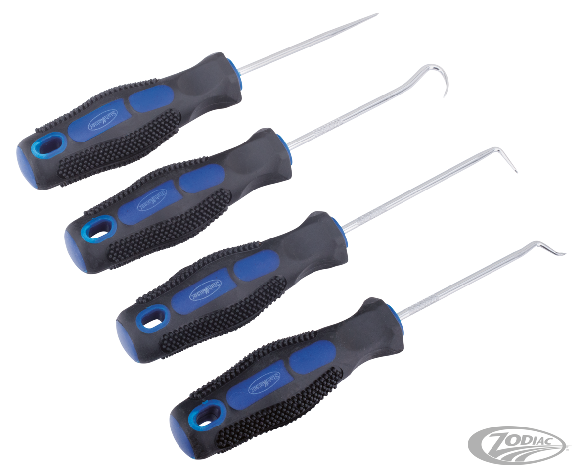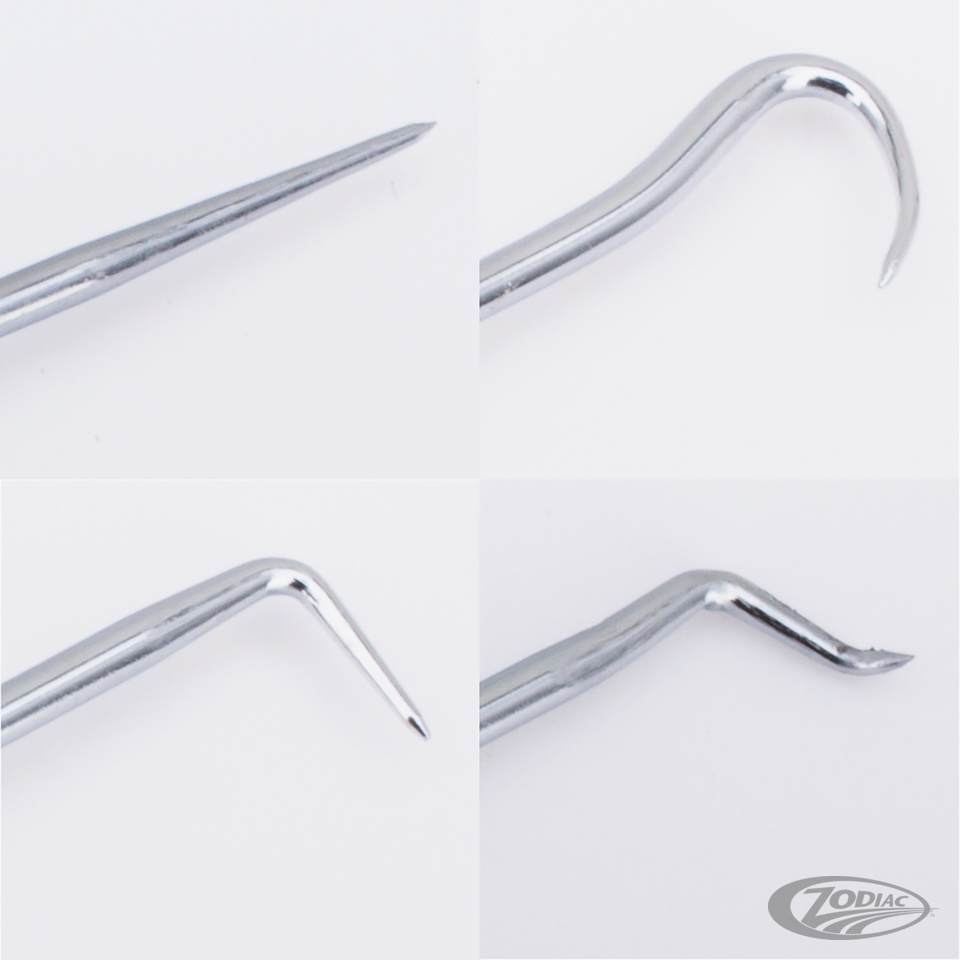 Semi-professional dental pick set. Use to remove O-rings from shafts and castings. Includes straight, 45 and 90 degree angled and hook-style picks with comfort grips with a total length of 145mm.