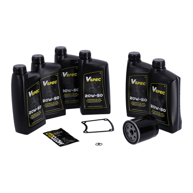 Includes: 6 liters SAE 20W50 3-1 full synthetic engine / primary / transmission oil; 63805-80A oil filter chrome; 34906-85D inspection cover gasket; 11105 O-ring drain plug. Quality 20W50 full synthetic Vspec oil. Special All in One solution blend for use as engine / primary / transmission oil. Okay to mix with all mineral and semi-synthetic oils. Meets or exceeds JASO MA/2. Our 'Big Oil' kit includes enough Vspec engine; transmission and primary oil to service the specific models as mentioned. Kit includes a chrome or black spin-on oil filter and all required drain plug seals and a primary derby/inspection cover gasket/seal to get the job done. The 'Big Oil' kit is perfect to full oil-service your bike during a regular service interval or before you store it for the for the winter period. Note: Comes with genuine Vspec high quality motor oil for all stock to high output engines. Note: OEM part numbers are given for reference only. Note: Used oil may contain harmful acids and/or other contaminants. Therefore it is advised to do an oil and filter change before winter storage. Note: Check your service manual for the recommended factory oil change intervals and oil change quantities.