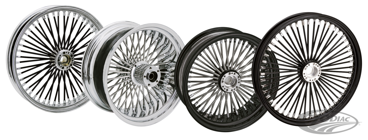 Dies sind die originalen Fat 50's (Fat Daddy Räder). Werden in den USA hergestellt und mit 50 geraden 3/8" Edelstahlspeichen und Custom-Speichennippeln radial eingespeicht. Nur die originalen RWW Räder besitzen Custom Radnaben aus Billet-Alu und Stahlfelgenringe. Alle Räder, ausgenommen 19x2.15" und 21x2.15" Räder, werden komplett versiegelt für die Verwendung von schlauchlosen Reifen geliefert. Die Räder in der Breite 4.25" für hinten passen bei den meisten Modellen durch einfache Anpassung der Achsspacer und Ausdistanzierung der Bremsscheibe und der Riemenscheibe. Die anderen, breiteren Hinterräder sind für breitere Schwingen in Verbindung mit Offset-Parts ausgelegt. Vorderräder für Softail werden als Singleflange Version für die Verwendung einer Bremsscheibe ausgelegt, alle anderen Räder besitzen Doppelflanschnaben zur Verwendung als Vorderrad mit zwei Bremsscheiben oder als Hinterrad mit einer Bremsscheibe und einer Riemenscheibe. Ausser den Rädern 18x10.50, 23x3.50 und 26x3.75 sind alle RWW Räder mit deutschem Gutachten. Alle RWW Räder besitzen eine DOT-Kennzeichnung