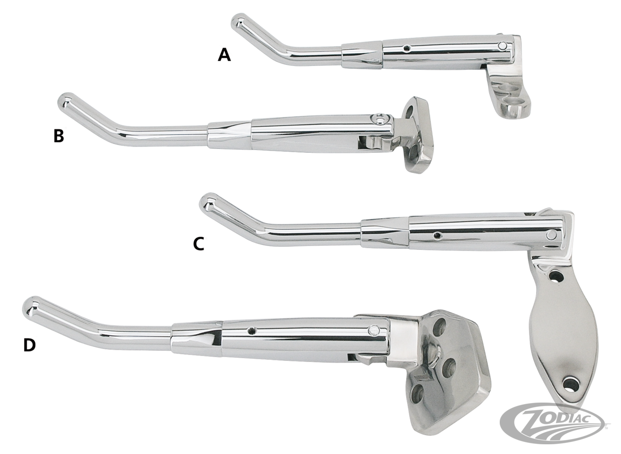 Diese hochglanzverchromten Seitenständer sind sogar in der Länge einstellbar (ca.20mm) und zeichnen sich durch eine integrierte Heavy-Duty Feder mit Kugelarretierung aus die den Ständer in der eingeklappten Position sicher arrettiert. Die Rahmenhalter sind aus hochglanzpoliertem Edelstahl gefertigt. Diese High Tech Ständer eignen sich genauso für Serien-Harleys wie auch für Custom Harleys. Sie zeichnen sich durch eine einfache Bolt-On Konstruktion sowie erforderliches Montagezubehör aus.