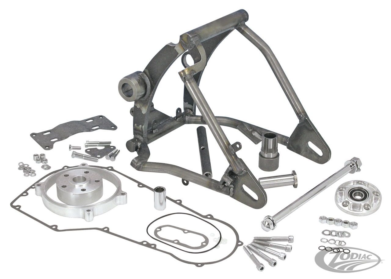 Diese Schwinge ermöglicht den Einbau eines 200er Reifens (auf 5,5" Felge) in den Originalrahmen mit Riemenantrieb, ohne diesen schmälern zu müssen. Jeder Satz beinhaltet die benötigten Teile der jeweiligen Baujahre. Die originalen Schutzbleche mit Haltern müssen natürlich weichen. Bei einigen Modellen muss auch die eckige Rahmenstrebe runtergeschliffen werden, um ein wenig mehr Freiraum für die Stossdämpferaugen zu schaffen. Besonders breite Schutzbleche bis 11" mit den dazugehörigen Haltern (ZPN236499) bieten wir in Kapitel 17 an. Jeder Schwingensatz beinhaltet folgende Teile: Off-set Schwinge, Radspannersatz, Radachse mit Distanzen, Off-set Getriebegrundplatte, Primärspacer, längere Primärkastenschrauben, KW-Zapfenverlängerung, verlängerte KW-Zapfenmutter sowie ein kompletter Dichtsatz mit zusätzlichem O-Ring. Ein spezieller Halter für die rechte Seite des Getriebes ermöglicht das Weglassen des 5. Stehbolzens. Dies wiederum ermöglicht die Beibehaltung der originalen oder entsprechenden Zubehördämpfer. Einzelteile sind auch alle separat erhältlich.