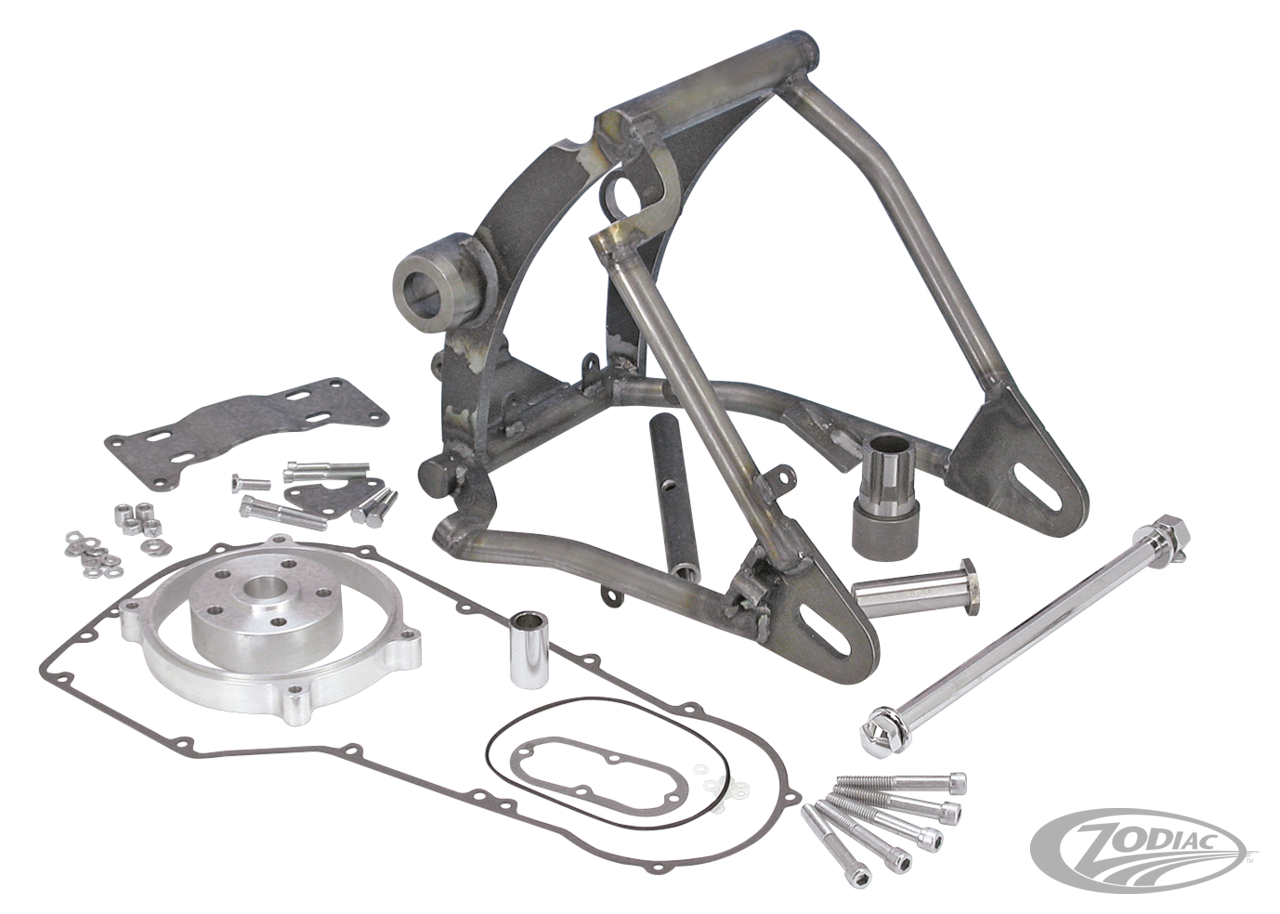 Diese Schwinge ermöglicht den Einbau eines 200er Reifens (auf 5,5" Felge) in den Originalrahmen mit Riemenantrieb, ohne diesen schmälern zu müssen. Jeder Satz beinhaltet die benötigten Teile der jeweiligen Baujahre. Die originalen Schutzbleche mit Haltern müssen natürlich weichen. Bei einigen Modellen muss auch die eckige Rahmenstrebe runtergeschliffen werden, um ein wenig mehr Freiraum für die Stossdämpferaugen zu schaffen. Besonders breite Schutzbleche bis 11" mit den dazugehörigen Haltern (ZPN236499) bieten wir in Kapitel 17 an. Jeder Schwingensatz beinhaltet folgende Teile: Off-set Schwinge, Radspannersatz, Radachse mit Distanzen, Off-set Getriebegrundplatte, Primärspacer, längere Primärkastenschrauben, KW-Zapfenverlängerung, verlängerte KW-Zapfenmutter sowie ein kompletter Dichtsatz mit zusätzlichem O-Ring. Ein spezieller Halter für die rechte Seite des Getriebes ermöglicht das Weglassen des 5. Stehbolzens. Dies wiederum ermöglicht die Beibehaltung der originalen oder entsprechenden Zubehördämpfer. Einzelteile sind auch alle separat erhältlich.