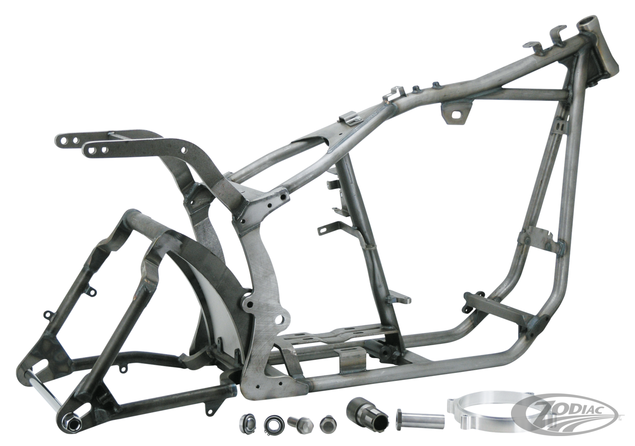 Für diejenigen die ihren Wide-Tail Rahmen oder Softailrahmen auf den 230x15" AVON Reifen auf einer 8" Felge, welcher 250mm misst, umrüsten möchte, bieten wir einen x-tra breiten Schwingensatz an, der einfach in den OEM-Rahmen sowie unseren Wide-Tail Rahmen montiert werden kann. Bei dem Widetail-Rahmen kann der Sekundärriemen beibehalten werden, bei dem Originalrahmen muss auf Kette oder den besonders schmalen 20mm Sekundärriemen umgerüstet werden. Wenn Sie diesen 20mm Riemen oder eine Kette im Widetail Rahmen verwenden haben Sie sogar Platz für Reifenbreiten bis 250mm. Das Komplettkit beinhaltet: •eine komplett WIG-geschweisste Schwinge mit Edelstahl-Spritzschutz •Hinterradachse mit verchromten Muttern •Verlängerte KW–Zapfen für Modelle von 1986-1999 •Verlängerte KW-Zapfenmutter für Modelle von 1991-1999 •Primär-Distanzring mit längeren Schrauben für den Primärkasten •Primärkasten Dichtsatz inkl. O-Ringen •Versetzte Getriebe-Grundplatte •Komplett neuen Halter mit Montagematerial zur Aufnahme des 5. Getriebestehbolzens. Diese Kits können ebenfalls für Modelle von 1987-1990 verwendet werden wenn die korrekte KW-Zapfenverlängerung mit Mutter und Dichtsatz verwendet werden. Aufgrund der Vielfalt der möglichen Rad-Reifenkombinationen werden keinerlei Raddistanzen mitgeliefert. Diese finden Sie ebenfalls in diesem Katalog und müssen je nach Bedarf separat bestellt werden.